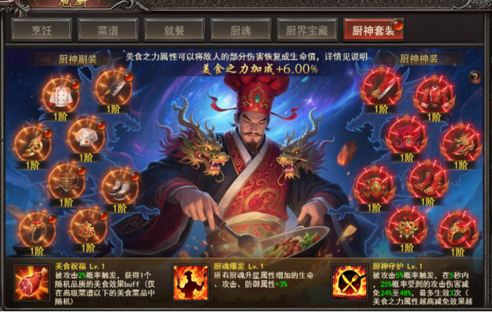 厨魂爆发:穿戴1阶5件套激活,所有厨魂升星属性增加的生命、攻击、防御属性+3%